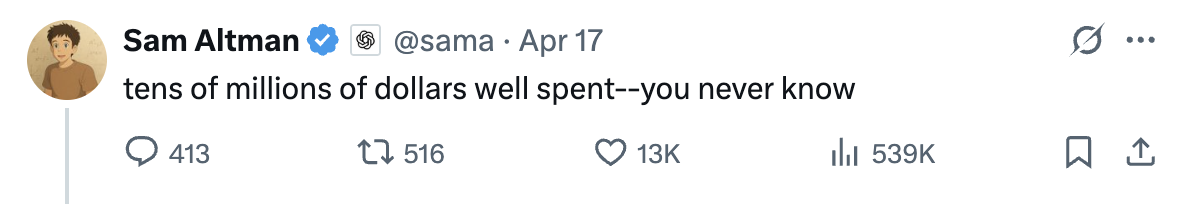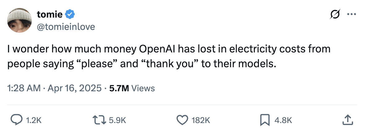 Dans un échange sur X, le CEO répond “des dizaines de millions bien dépensés – on sait jamais” à un utilisateur du réseau social lui demandant combien coûte en énergie notre politesse sur l’outil d’intelligence artificielle. Ce “on sait jamais” s’adresse, une fois de plus, aux 12 % de personnes qui, selon une enquête relayée par TechRadar, mettent les formes pour être dans les petits circuits des IA quand elles vont conquérir le monde.