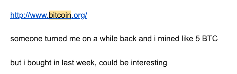 La fois où un bon ami d’internet m’a parlé du bitcoin dans un mail daté d’avril 2011, alors qu’il venait symboliquement de passer la barre du dollar. Si j’avais écouté ce bon ami d’internet et que j’avais misé mes 300 euros, ils vaudraient environ 27 millions aujourd’hui.