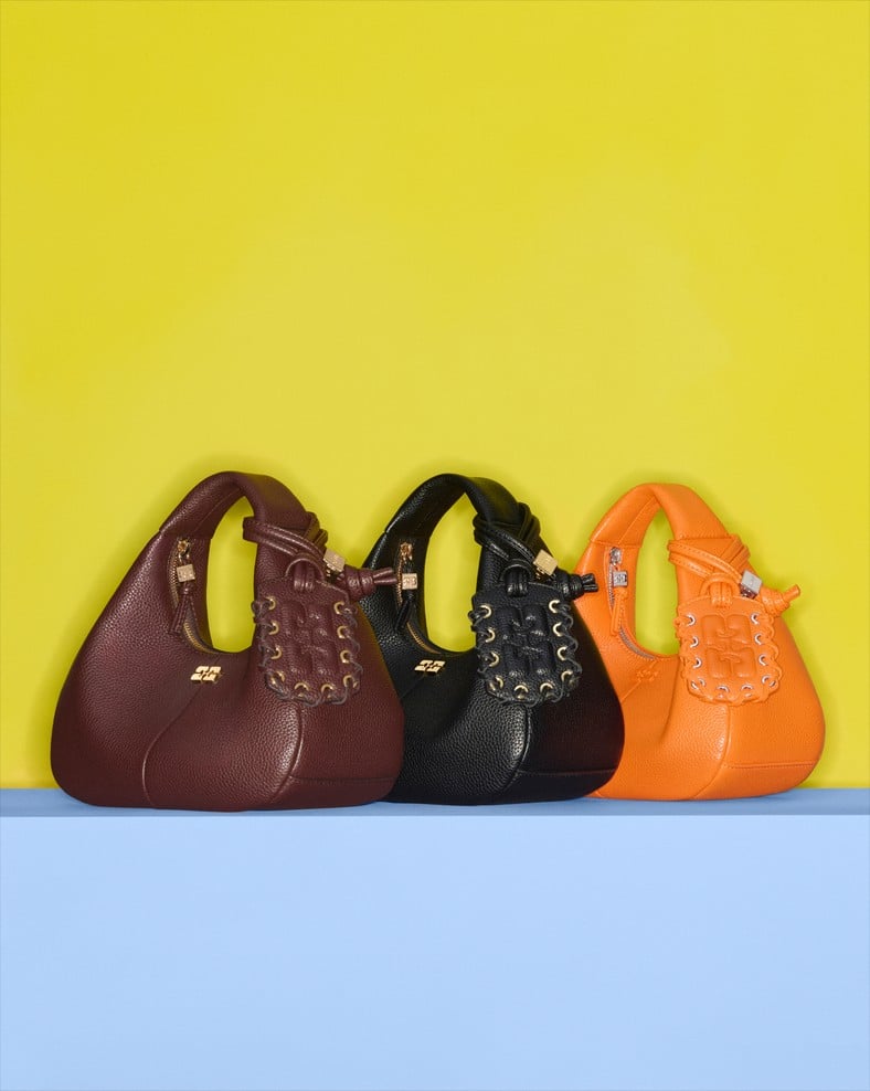 Pardon, mais c’est possible de tomber amoureux d’un sac à main ? Ganni vient de sortir le mini Hobo et je ne sais pas pourquoi, mais la campagne allume la petite case de mon cerveau où se niche l’équilibre. La taille, la poignée, le coloris orange, c’est mon premier crush de l’été. (395 euros)