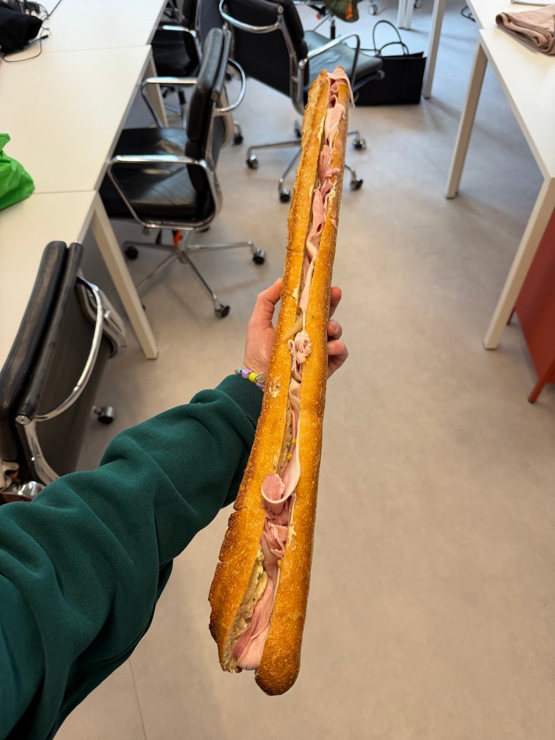 Ça, c’est le jambon-beurre que nous a envoyé La Grande Épicerie de Paris au bureau. À vous de deviner si j’ai un petit bras ou un très grand (et délicieux) sandwich.