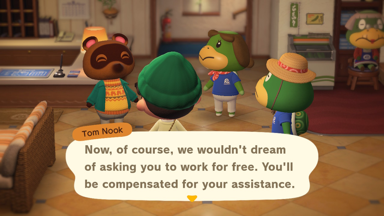 Dans le lobby, Tom Nook est là, toujours prêt à m’enrober de sucre une nouvelle mission. Cette fois-ci, me voilà chargé de décorer et d'aménager les chambres de ce nouvel établissement, fleuron des îles avoisinantes, prêt à recevoir des touristes de passage dans la région. Mon salaire ? Des tickets à échanger contre des babioles. Je sais déjà que je me fais avoir, mais quel plaisir de retrouver ce que je sais faire.
