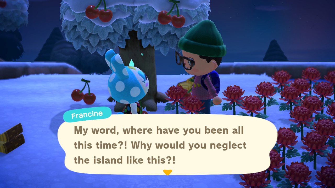5 ans plus tard, dans mes mails, une proposition pour jouer à la mise à jour 3.0 du jeu. Fébrile, j’ai relancé ma sauvegarde, téléchargé l’update, et croisé les doigts pour ne pas devoir trop de thunes à ce sacré Tom Nook. Le temps est passé dans ma vie, mais aussi dans celle de mes colocs d’île, et eux se souviennent bien de la sieste de quelques années que je viens de me taper. L’enclos de ma maison croule sous les fleurs, les branches des arbres se plient sous le poids des fruits pas récoltés, et la plage est couverte de coquillages pas ramassés.
