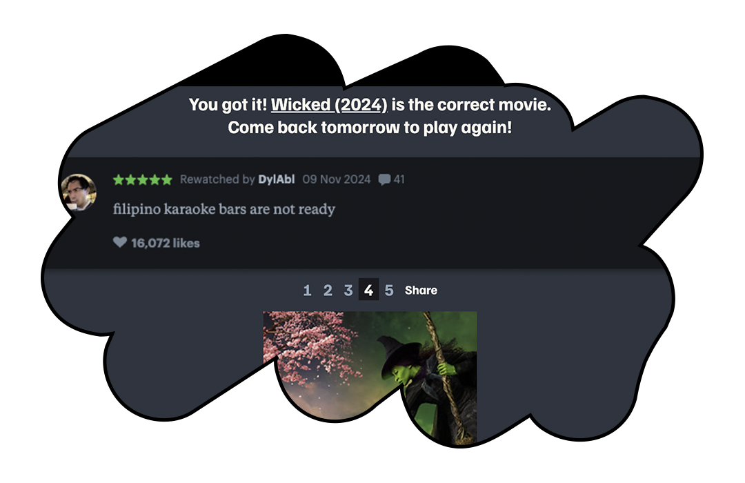 Ce jeu, on a forcément envie d’y jouer à la maison, à la manière d’un bon Roland Gamos, en soirée, à digger les meilleures courtes critiques bien référencées. Vu qu’internet est magique et réalise toujours nos vœux, l’utilisateur de Reddit Xenonaut1001 a codé une version en ligne baptisée Guessmovie, qui permet, à la manière de Wordle ou Cemantix, de jouer une nouvelle partie chaque jour. Le concept est simple : 5 critiques Letterboxd pour découvrir un film. Ce lundi 17 mars, c’est l’indice “Filipino karaoke bars are not ready” qui m’a évidemment fait deviner Wicked. Allez, ça part direct en favori.
